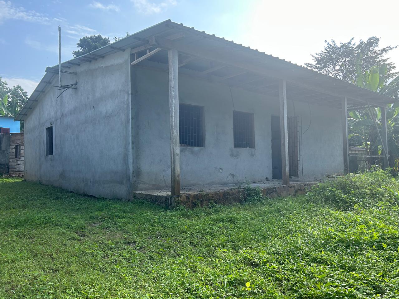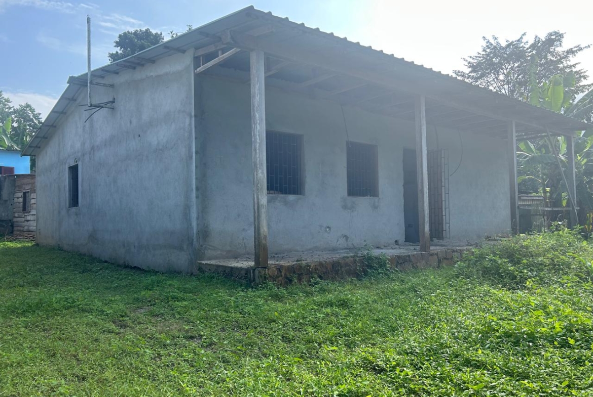 Estrutura simples, com paredes rebocadas e coberta por telhado metálico.
