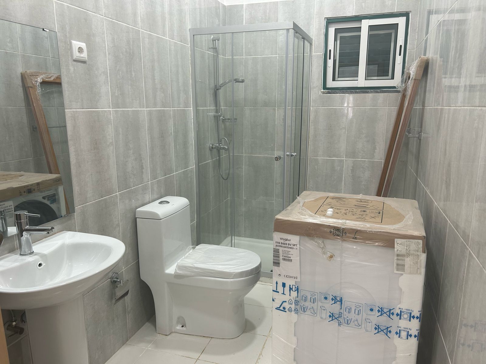 2 casas de banho modernas, ambas com base de duche e revestimento em azulejo cinza de qualidade